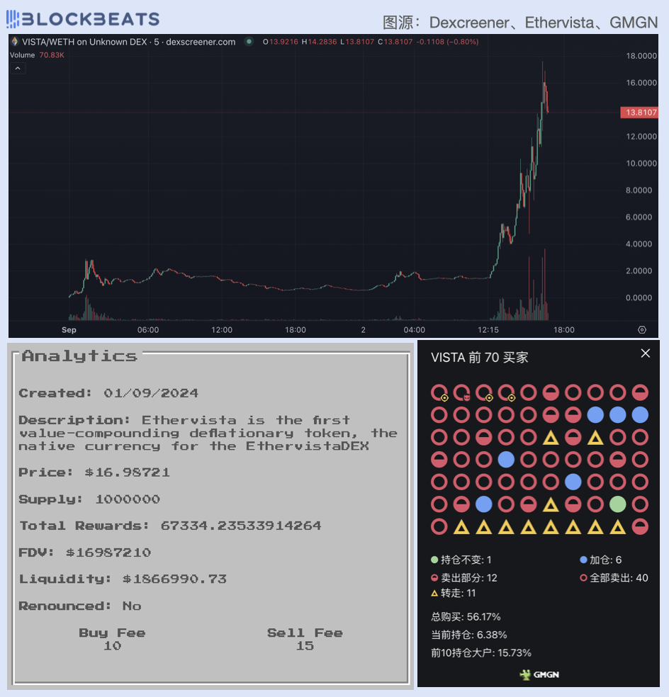 EtherVista 的平台代币为$VISTA 上线于 9 月 1 日凌晨 0 时,今日中午,VISTA 突然开始飙升,5 小时涨幅 10 倍,交易量超 850 万美元,目前市值为 1300 万美元。EtherVista 上显示,VISTA 共为其 LP 产生了 67,334 美元的奖励。GMGN数据显示,VISTA前70名买家共购买了56%的代币,目前持仓份额为6.38%。