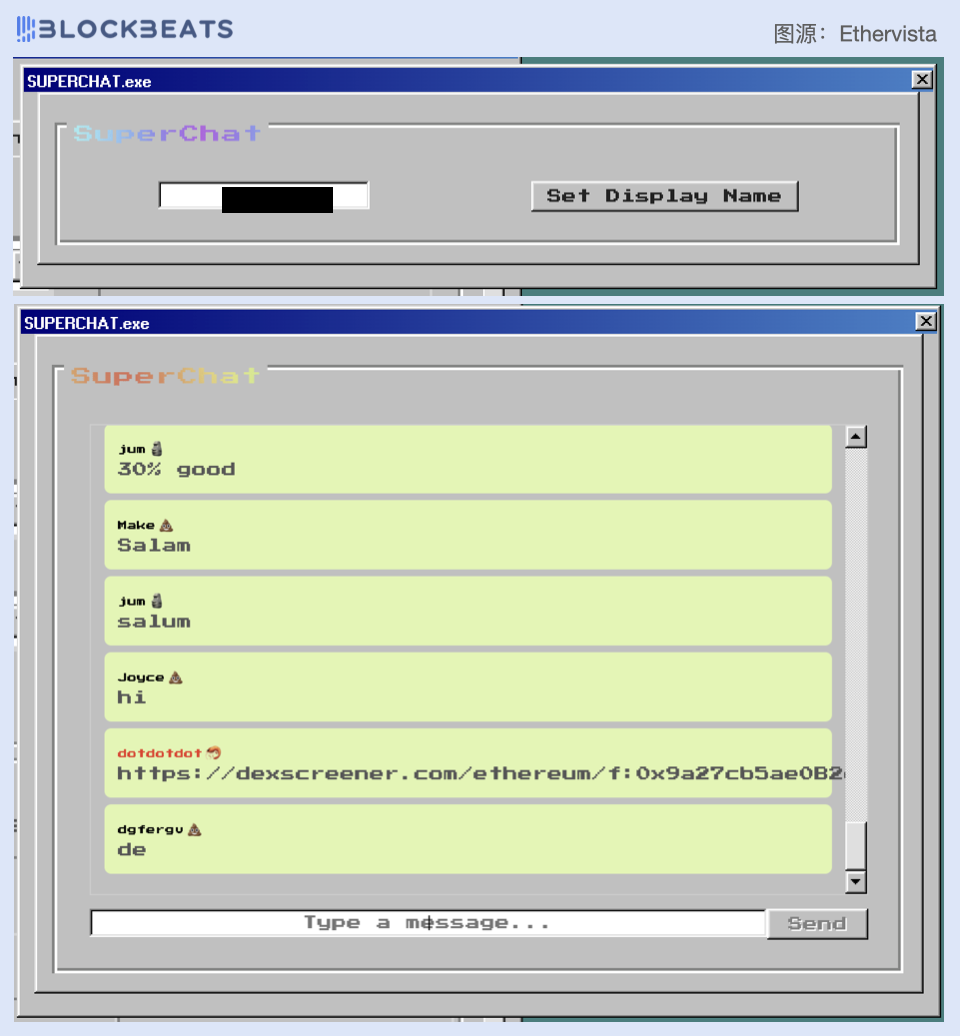 另外,Ethervista 平台集成了实时聊天功能,进入 SuperChat 窗口,设置一个用户名后就可以在界面中聊天。这个功能类似于 Pum.fun 的代币评论区,但更为简易粗糙。