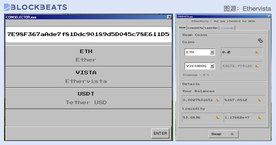 今日,一个诞生 1 日、名为「VISTA」的新代币用一个下午的时间涨幅超 10 倍,而在 Dexscreener 上,VISTA 的详情信息还提示为「未知 DEX」。VISTA 来自一个刚开始运行 1 日的 DEX EtherVista,其自称为「挑战 Uniswap 的 DEX」,被一些代币持有者称为「以太坊上的 Pump.fun」,目前已有数个代币在 EtherVista 部署发行。