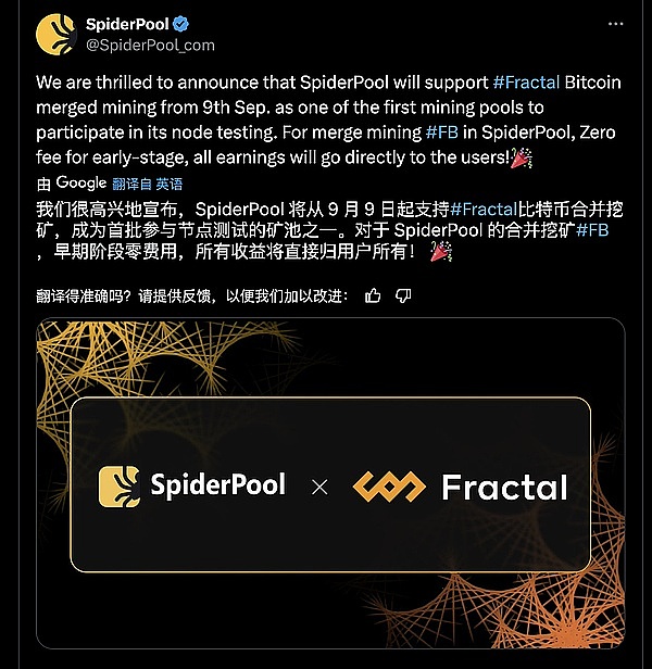 ● SpiderPool @SpiderPool_com 将从 9 月 9 日起支持 #Fractal 比特币合并挖矿,成为首批参与节点测试的矿池之一。对于 SpiderPool 的合并挖矿 #FB,早期阶段零费用,所有收益将直接归用户所有。