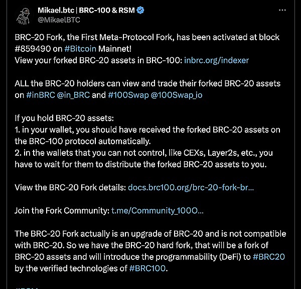 ● BRC-20 Fork,第一个元协议分叉,已在 Bitcoin 主网上的 #859490 区块激活!如果您持有 BRC-20 资产,在您的钱包中,您应该已经自动收到了 BRC-100 协议上的分叉 BRC-20 资产。在您无法控制的钱包中,如 CEX、Layer2s 等,您必须等待他们将分叉的 BRC-20 资产分发给您。by @MikaelBTC