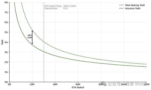 总质押收益曲线(绿色虚线):ETH的固定增发收益加上MEV收益,构成了质押者的总质押收益。这里要注意,MEV收益率的计算方式为:MEV收益总量(去年约为30万个ETH)除以被质押的ETH总量。