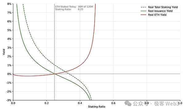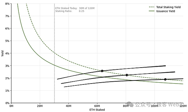 为了避免质押参与度过低,以太坊在质押参与度较低时设置了高回报来吸引更多质押者。