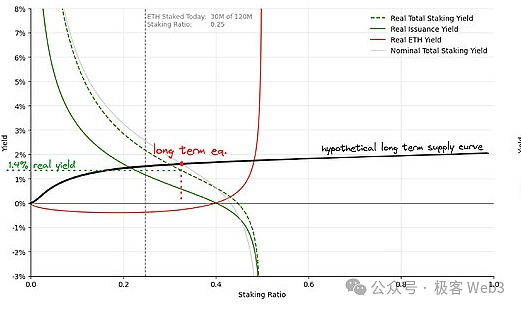 综合考虑需求和供应等因素,我们可以推测出ETH质押能维持的长期均衡状态。前面我们提到,当质押参与率较低时,需求曲线表现出明显的倾向性,但对于长期内可能达到的具体质押比例没有明确结论。