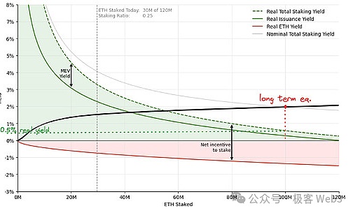 需要强调的是,这种收益构成的变化并不会降低质押的激励作用。如果只看结果,稀释保护和真金白银的正收益,对于用户来说同样具有吸引力。然而,两种不同性质的收益对用户的意义截然不同:当质押比例较低时,质押是一项由以太坊协议为之买单的、有利可图的服务;相反,当质押比例升高时,质押变成了一种对冲通胀的无奈之举。