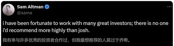 山姆·奥特曼对约书亚·库什纳和Thrive Capital非常信任,甚至在社交平台上,公开“吹捧”:“我有幸与许多优秀的投资者合作过,但我最想推荐的人莫过于乔希(约书亚·库什纳)。”