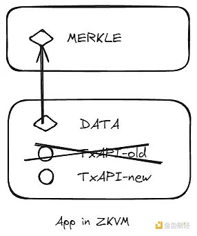 要解决这个问题,首先是要解决数据复用问题和数据升级问题。当游戏的逻辑修改,我们仍然希望原来的数据可以原封不动被保留。这里的最佳零成本解决方案,是独立的App As A rollup。因为在App rollup 中,原先数据的默克尔根可以直接复用,而对逻辑的修改只需要体现在代码逻辑中。