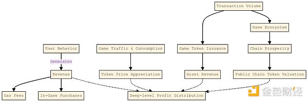 收益关系会更为复杂,且隐藏着更深层次的利益分配问题:一方面,用户行为会产生收益,包括链的gas收益,游戏内容消费收费;另一方面,游戏流量和消费带来了币价增值,有交易量的游戏通过发行游戏代币产生了资产收益,同时也给链带来了繁荣的生态效应,进一步增加了公链的代币估值预期。