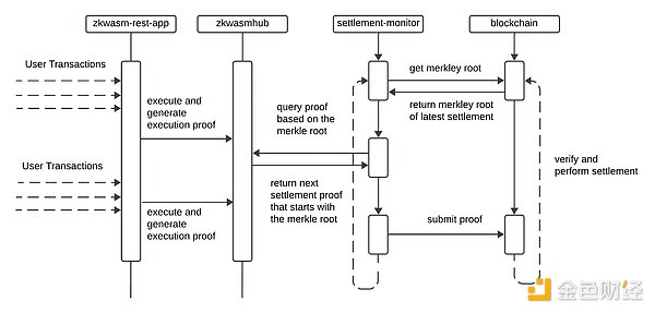 其核心流程是:接收交易、在WASM虚拟机中处理交易、使用zkWASM云服务生成证明,最后将证明提交到区块链进行验证和结算。整个过程保证了交易的隐私性和安全性,同时大大提高了区块链的扩展性。开发者只需关注应用逻辑,而不必深入理解复杂的零知识证明技术细节。它还包含了一个Rollup监控系统,可以使用证明和交易数据触发链上结算,通过存储Merkle根和verify API来验证证明,确保按照链上Merkle根的顺序进行结算。此外,该SDK还简化了本地开发环境的搭建,只需启动MongoDB和Redis,运行dbservice,然后在ts目录下执行npm run server即可启动完整的本地服务。