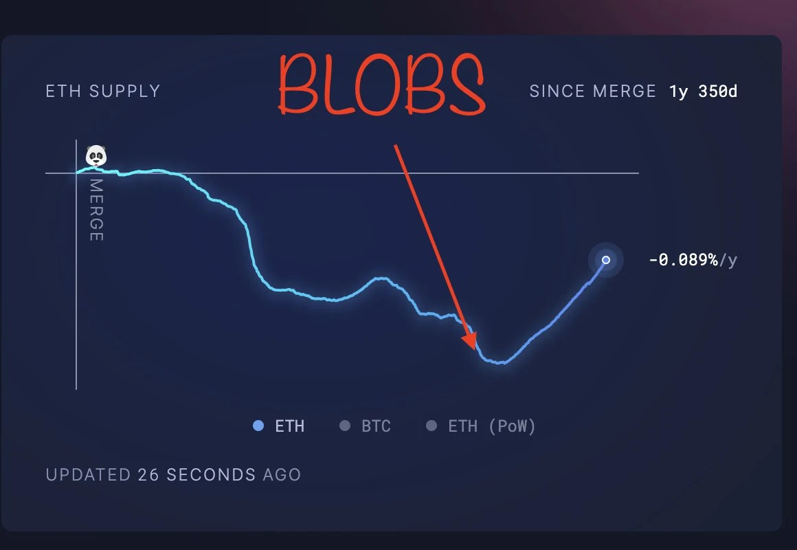 事后回看,坎昆升级在降费方面表现相当理想,随着 Blob 的引入,L2 网络的交易费用显著降低,而随着与普通交易共同「挤」在 calldate 的 L2 相关交易被移至 Blob,以太坊主网本身的交易费用也出现了一定下降。这本是件「皆大欢喜」的事情,但随着时间的推移,部分观察者却发现 ETH 的供应趋势出现了变化——从通缩状态,逐渐转向通胀。