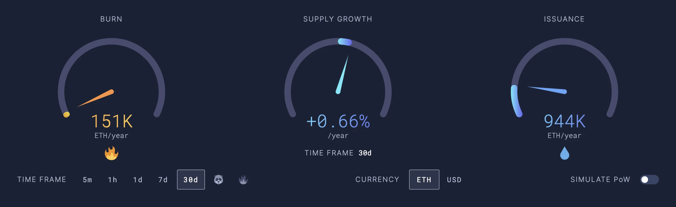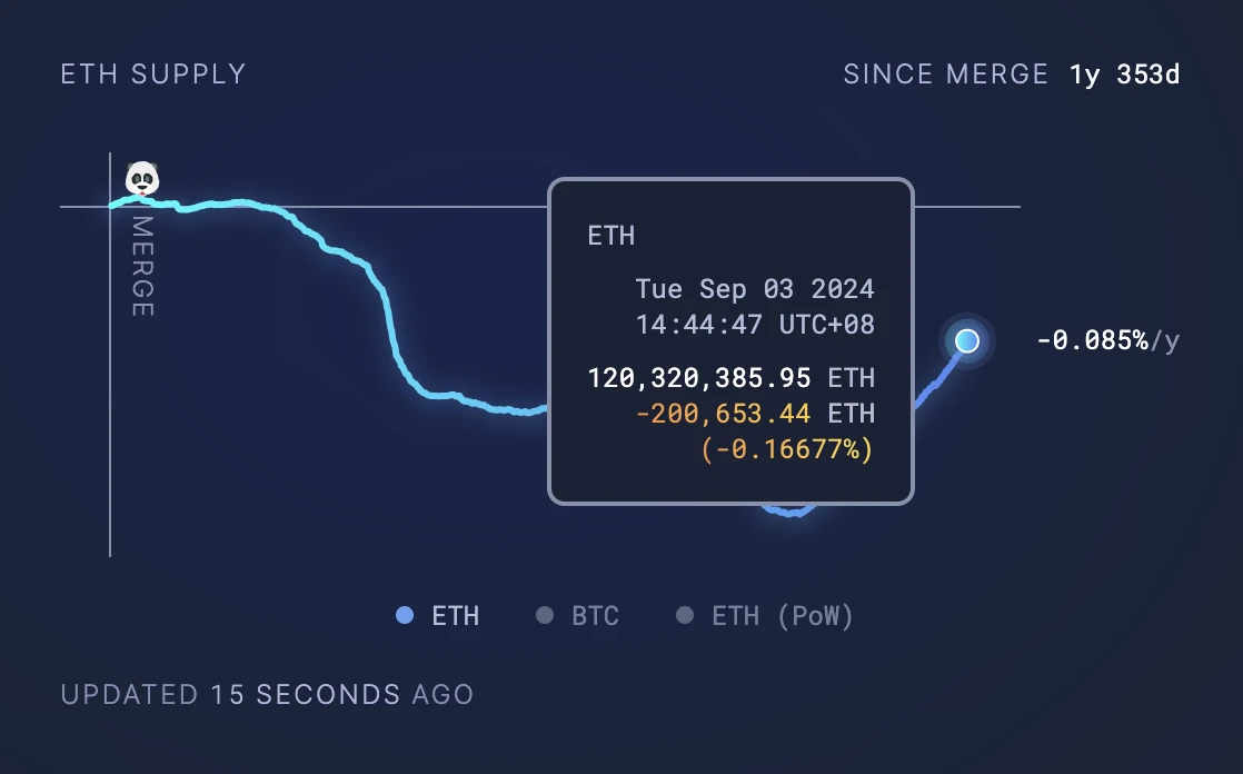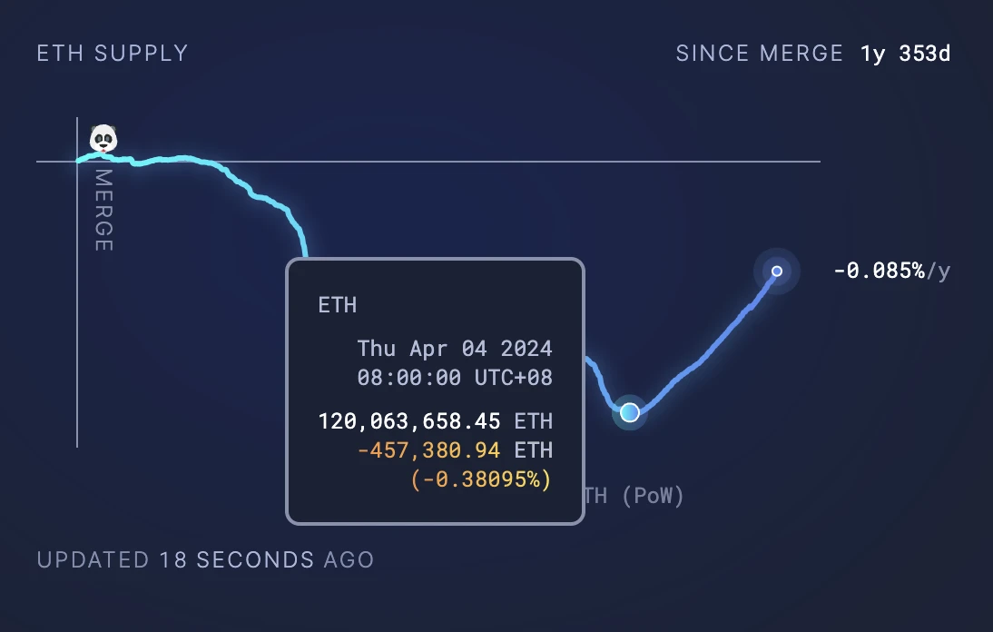 之所以造成这一情况,是因为以太坊自三年前 EIP-1559 落地以来便引入了「将部分交易费用直接销毁」的供应调整机制,以永久减少流通中的 ETH,降低以太坊的通胀水平。