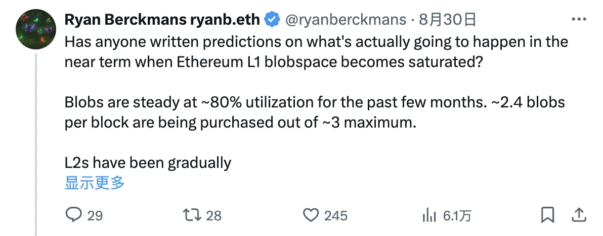 在近期的 X 文章中,Ryan 提到过去几个月内 Blob 的利用率大约稳定在 80% 左右,每个区块大约会购买 2.4 个 Blob(上限为 3 个);与此同时,L2 本身则在不断改进 Blob 利用效率。