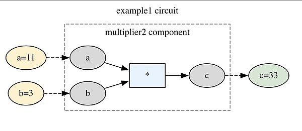最重要的行是 c <== a * b;。这是我们实际声明约束的地方。这个表达式实际上是两个的组合:<--(赋值)和 ===(等式约束)。 [^7] Circom 中的约束只能使用涉及常量、加法或乘法的操作。它强制要求方程的两边必须相等。 [^8]