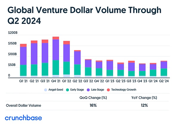 市场没钱,即便几乎所有的VC都陷入FOMO,美股整体风投的趋势依然不增反降。根据Crunch base的数据,今年上半年全球融资总额同比下降5%。