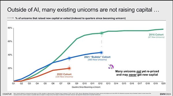 一是退出路径不畅,VC投资很犹豫。在上一轮“万物泡沫”之后,独角兽公司数量猛增,从2016年的67个一路涨到2021年的580个。但他们获得再融资的比率却在直线走低。从16年到22年,同期获得再融资的独角兽比例从50%降到了20%以下。