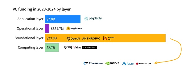 我们发现,进入人工智能领域的钱,大部分流向基础层公司(Foundational layer),也就是我们所熟知的大模型公司,如OpenAI、Anthropic、Gemini等。