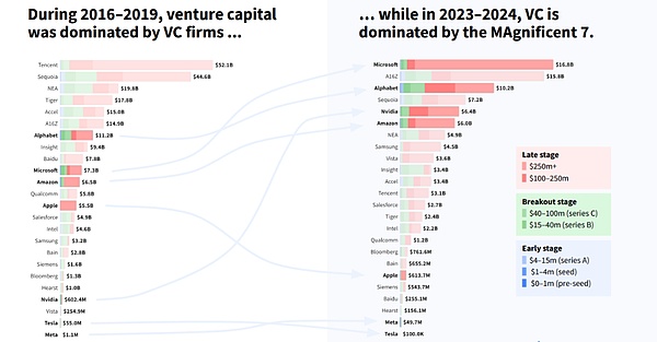 以至于在过去一年里,七巨头成了AI最大的投资者,仅2023年间就参与了208笔风险项目的投资。