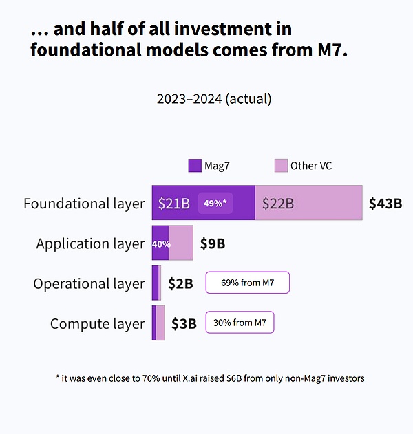 不论是大模型还是芯片公司,背后均不乏七巨头的身影,甚至在马斯克的X.ai从非七巨头投资者那筹集到60亿美金之前,七巨头占了所有基础模型投资近70%的投资额。