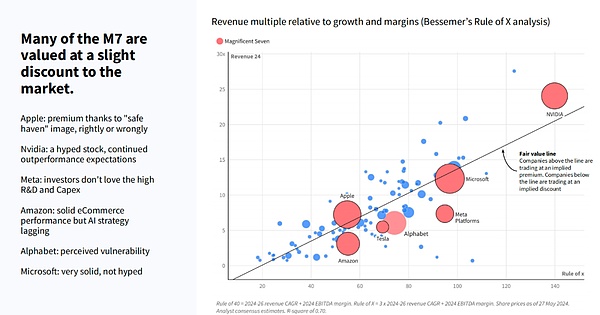 这是一张利用"Rule of X"来评估七巨头的市值相对于它们的收入增长和利润率的图表。