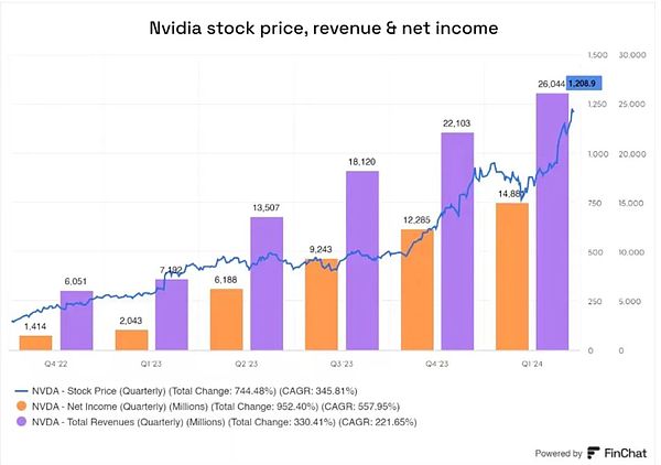 哪怕是被认为最有泡沫嫌疑的英伟达,截至2024年第一季度,过去6个季度股价上涨744%,利润也上涨了330%,可以说是最有基本面支持的泡沫。