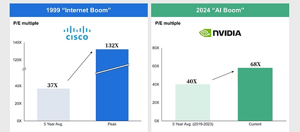 对冲基金COATUE还做过一个测算。若以互联网泡沫时期增长最为明显的思科为例,其五年平均市盈率为37倍,但泡沫时期高达132倍。