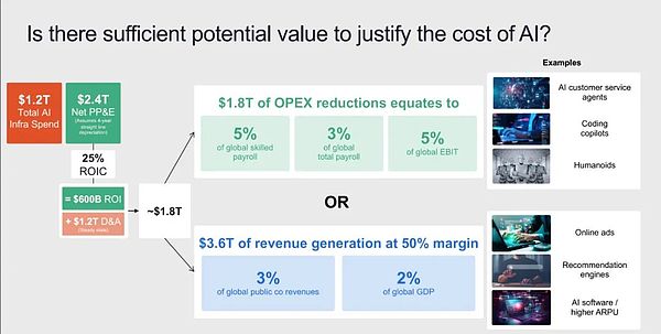 按照25%的ROI,即预期收益6000亿美元,加上1.2万亿,到2030年AI的投入必须转化出1.8万亿美元的收入才能实现收支平衡。
