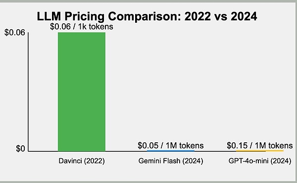 从实际市场价格看,两年前,GPT 3.5 每千个 Token 就要 0.06 美金。现在, Gemini Flash每百万 Token 只要 0.05 美金 。仅仅两年时间,AI的成本降低100x,能力提升10x。”