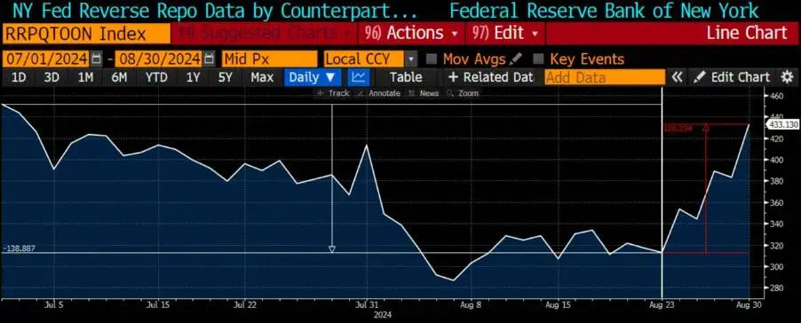 历史不会简单重复,但总是有相似之处。在我之前的文章 Sugar High 中,我未能充分认识到这一点,当时我讨论了鲍威尔工资政策转变的影响。对于即将到来的降息对风险市场的正面影响,我与大多数人持有相同的看法,这让我有些不安。在去首尔的路上,我偶然查看了我的彭博观察名单,上面记录着 RRP 的每日变化。我注意到 RRP 上升了,这让我感到困惑,因为我本以为由于美国财政部的净国库券发行,它会继续下降。我深入研究后发现,这一上升始于 8 月 23 日,也就是鲍威尔政策转变的那一天。我还考虑到 RRP 的激增是否可能由于季度末的粉饰账面造成。金融机构通常在季度末会将资金存入 RRP,并在下周撤出。但第三季度要到 9 月 30 日才结束,因此粉饰账面无法解释这一现象。