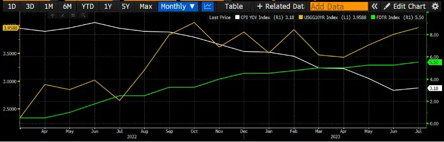 美国消费者价格指数 (白色)、10年期美国国债收益率 (金色) 和联邦基金利率上限 (绿色)