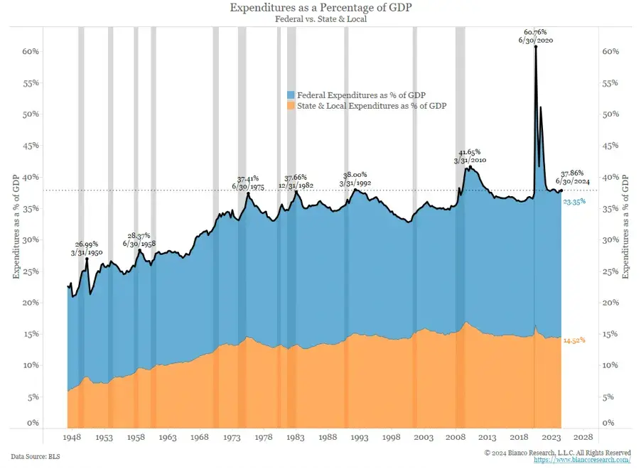 在和平时期,总体政府支出达到了历史最高水平。当然,这里的“和平”是相对的,仅指帝国公民的感受;对于那些因美国武器而丧命的人来说,近几年几乎称不上和平。