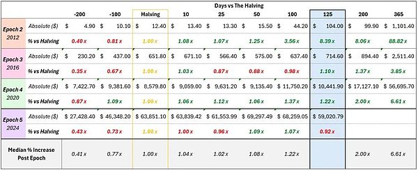 2024年比特币完成第4次减半,减半后的125天经历最糟糕的价格表现。价格下跌8%,而前几个减半周期涨幅为22%。