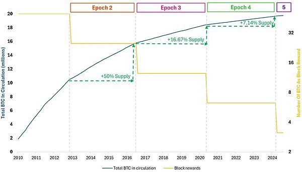 图3:比特币减半动态、区块奖励、总供应量和周期
