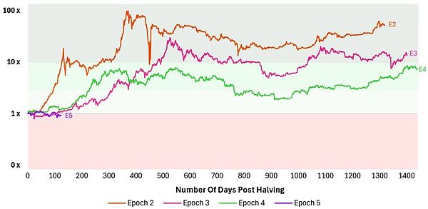 让我们先来看看比特币价格在过去几个减半周期中的表现。很明显,在减半后的第五个周期(2024年),比特币的表现是减半以来最差的,也是唯一一个比特币价格下跌的减半周期。