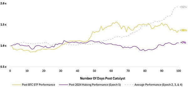 这是为4年周期辩护的无力论据。现实情况是,这两种催化剂是相互独立的。ETF是需求驱动的催化剂,而减半则是供应驱动的催化剂。它们并不相互排斥,如果减半仍然重要,我们应该看到双重催化剂带来的重大价格变动。