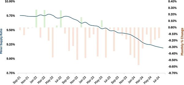 如图所示,矿工供应比例一直在稳步下降,目前约为9.2%。最近,矿工出售BTC的场外交易活动有所增加,这可能是为了避免对市场价格造成太大影响。造成这一趋势的原因可能是区块奖励减少、硬件和能源等投入成本增加以及BTC价格没有大幅上涨,迫使矿工更快地出售BTC以保持盈利。