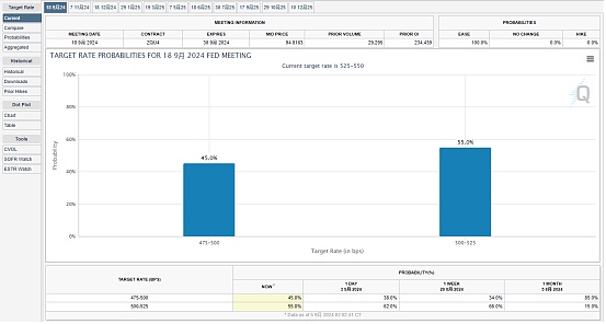 9月5日,据 CME「美联储观察」数据,美联储9月降息25个基点的概率为55%,降息50个基点的概率为 45%,而一天前美联储9月降息50个基点概率仅为38%。可以看出,降息已然成为市场基本共识,只是幅度还有待斟酌。
