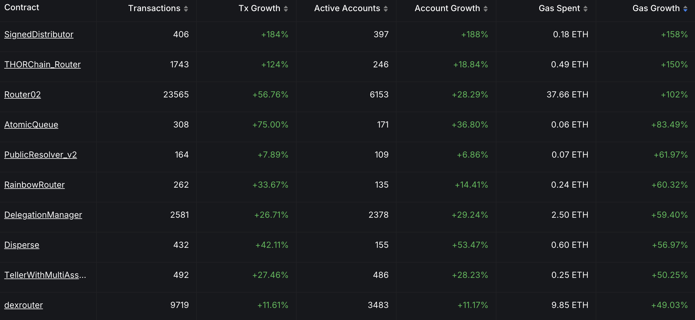 以太坊生态每日合约动态观察,按 Gas 消耗增速及部署时间筛选并排列