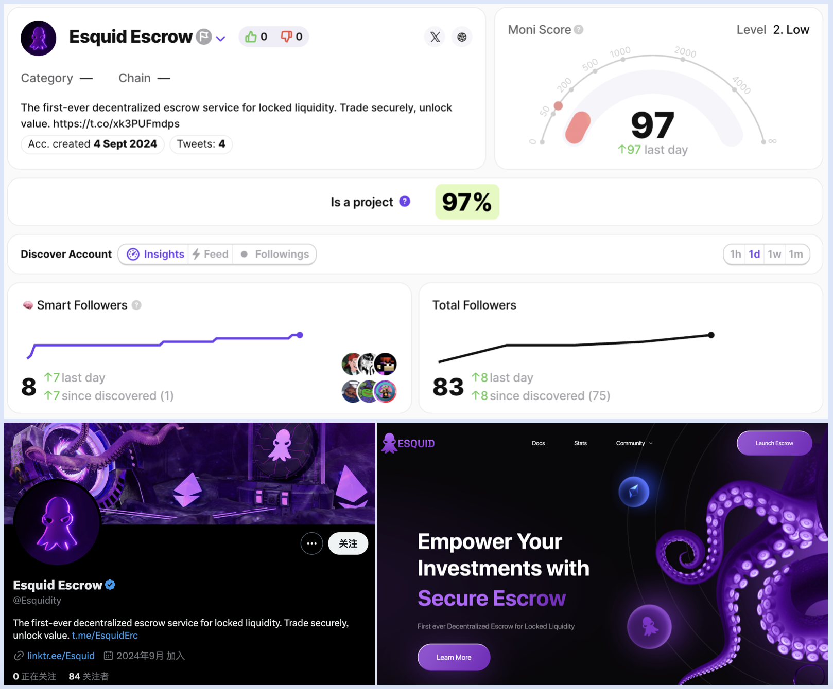 Esquid Escrow 用于锁定流动性的去中心化托管服务,用户可以放心地买卖锁定的流动性。无论是想提前释放流动性还是以折扣价购买,ESQUID 都能确保所有交易都是安全和透明的。