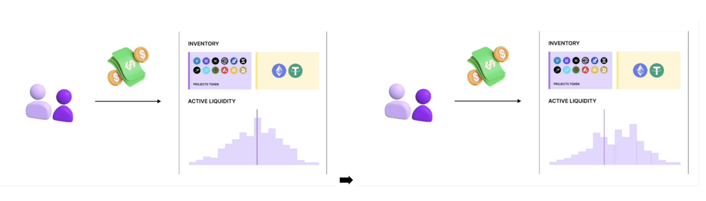 MaaS 将负责根据协议所有者的偏好在市场上动态维持一定水平的流动性。主动流动性逐渐再平衡,以 50-50(以太币/稳定币 - 项目代币)的比率在当前池价格附近实现深度流动性。