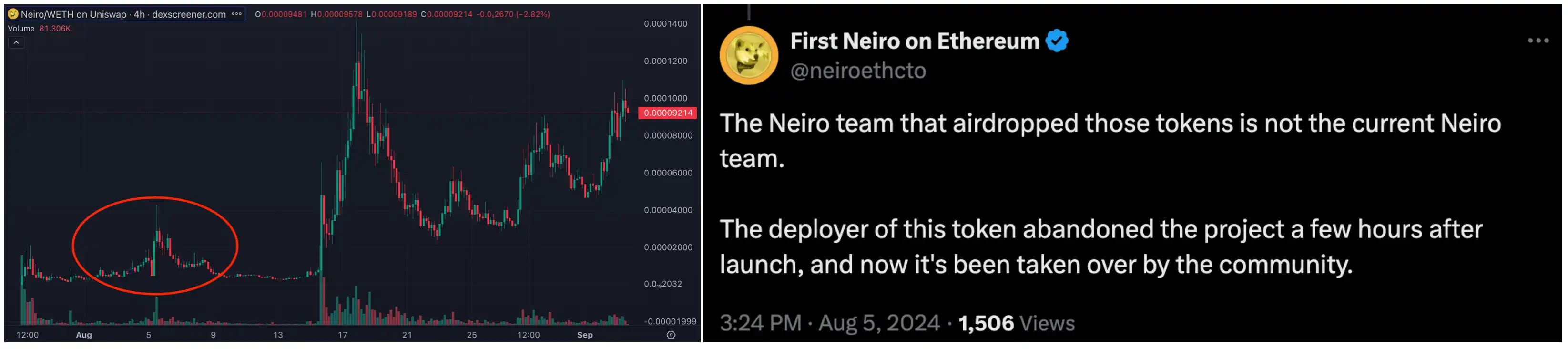随后,Neiro 现在的 CTO 团队 @neiroethcto 在 Vitalik 的回复下追加评论,表示空投代币的 Neiro 团队已经不再运营项目了,代币部署者在启动几个小时后就放弃了该项目,现在其已被社区接管。但被 Vitalik 回复而得来一波上涨后,Neiro 在之后的一周的跌幅又超 90%。8 月 13 日至 8 月 17 日,Neiro 涨幅近 50 倍,同期 NEIRO 下跌 44%,距高点跌到脚斩,市值 34M。
