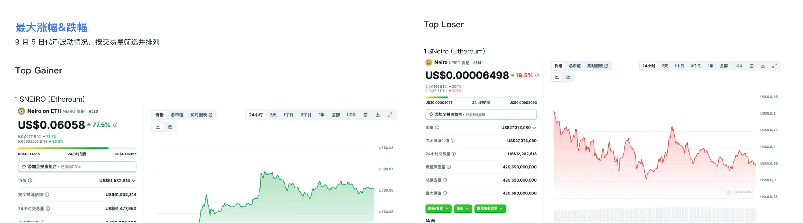 更有意思的是,最近几天阅读律动晚报的读者应该会发现,在 NEIRO 合约上线这则消息正式公布的前两天,NEIRO 和 Neiro 就不断出现在当日代币涨跌榜中,前者一直涨,后者一直跌。现在看上去,许多人像是早已拿到消息提前布局了。