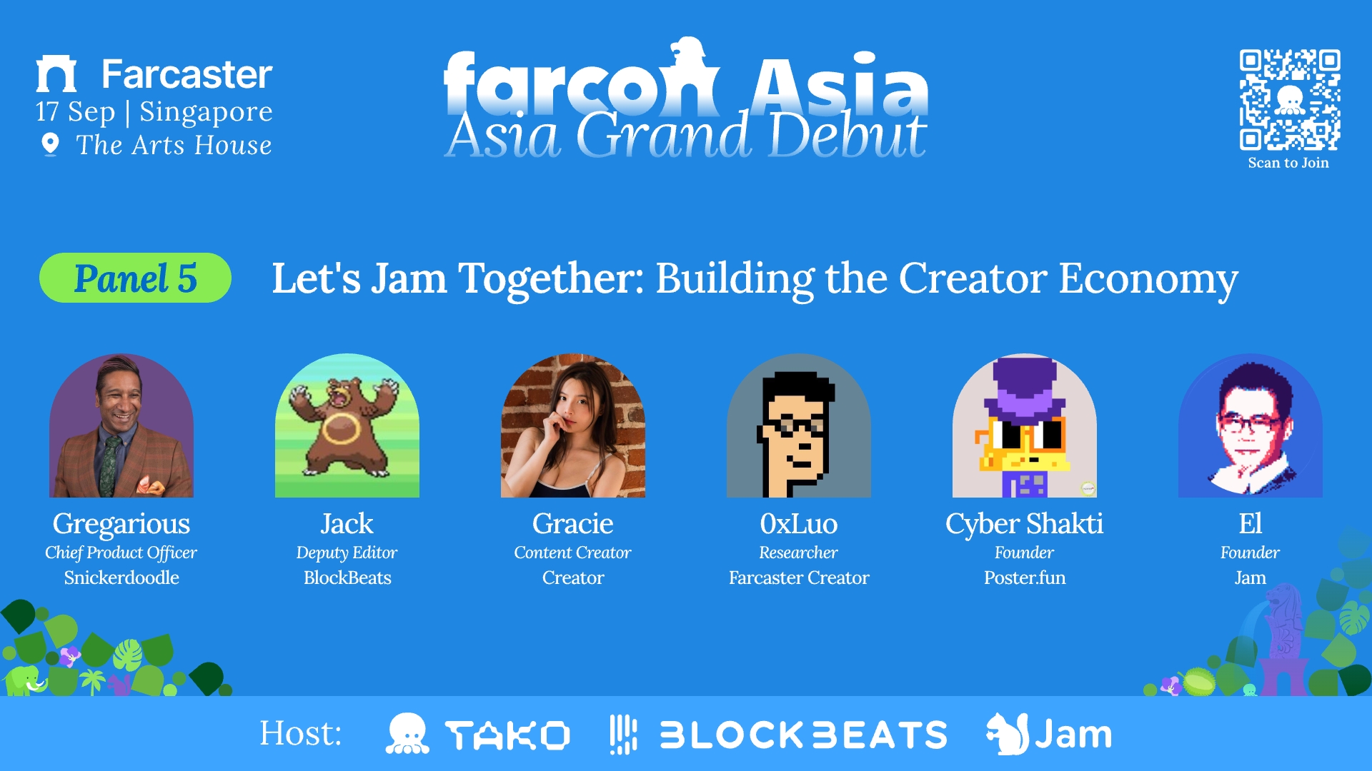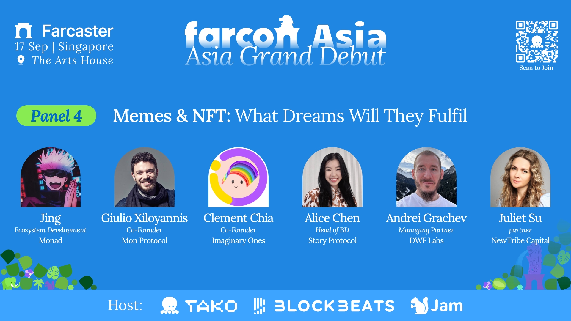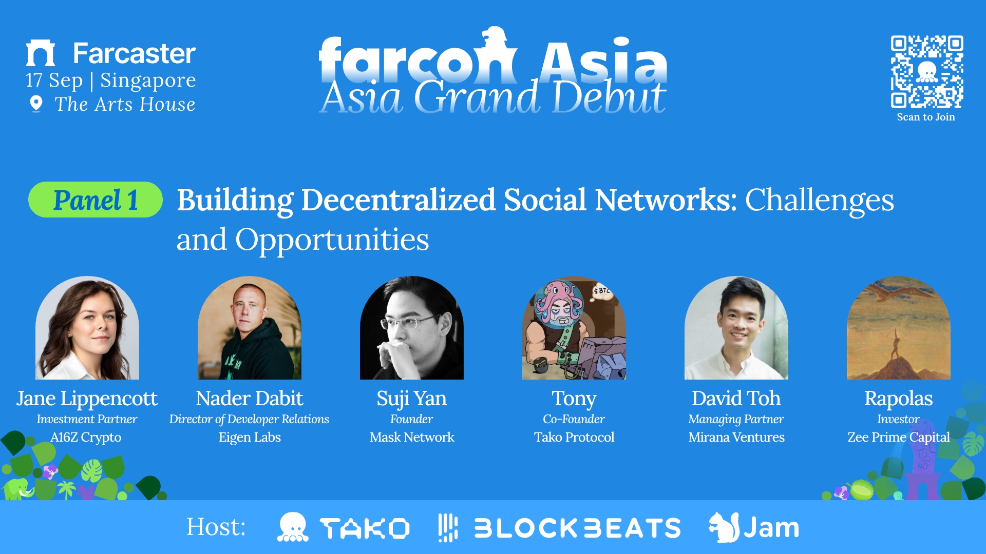 9 月 16 日至 17 日,Tako Protocol、律动 BlockBeats 与 Jam 将联合举办亚洲首次大型 Farcaster 生态线下活动,活动将在新加坡著名的 The Art House 举行。此次会议旨在深入探索和展示 Farcaster 生态系统的创新成果及 Web3 社交的未来前景,打破传统金融加密会议中单向输出的刻板印象,传递新的叙事视角,展示加密行业多面可能性,加密不仅局限于金融。除上文提及的 Farcaster 生态建设者们,FarCon Asia 也诚邀其他聚焦去中心化社交赛道的项目共同参与,一起探讨社交新模式,释放去中心化魅力。