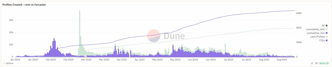 而另一边 Web3 社交领域的龙头项目 Farcaster 近期同样遭遇了用户增长与平台活跃度的双重困境。Farcaster 在年中时候每日发帖数和互动数一度在 14 万以上,这一良好势头在近一个月内出现了显著放缓,DAU 滑落至大约 10 万的水平,标志着 Farcaster 增长动能的减弱。