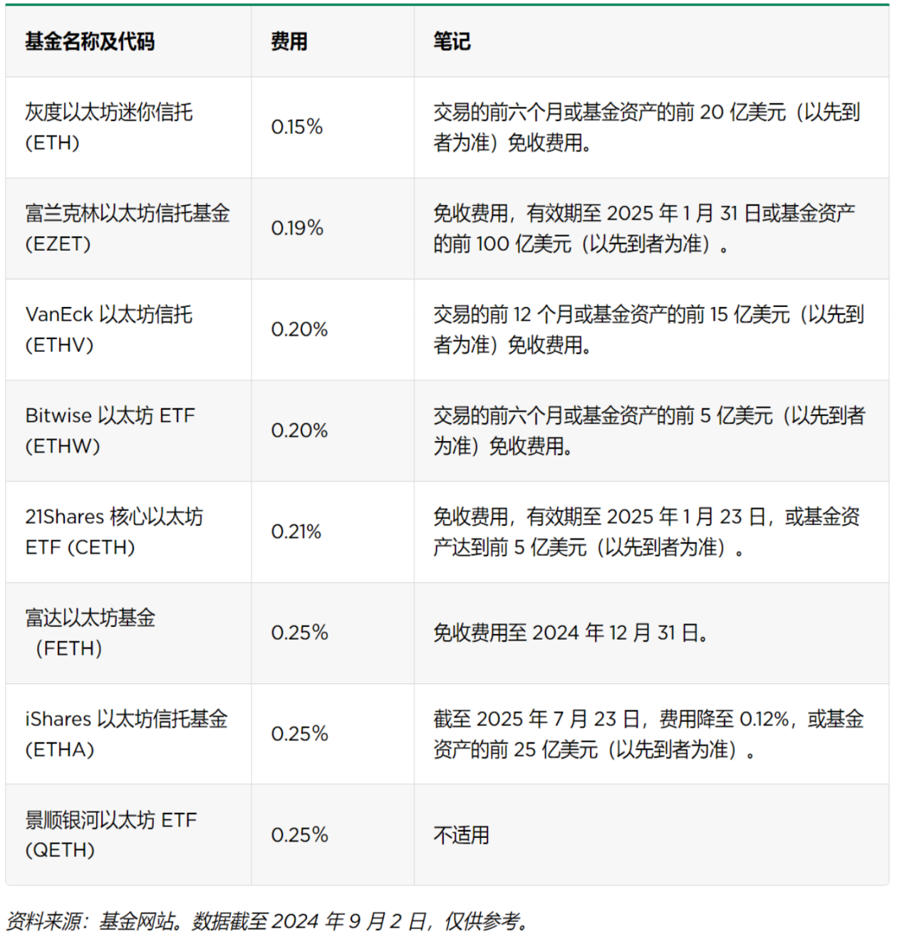 ETHE 是全球最大的以太坊现货基金,占本文撰写时以太坊总市值的 2% 以上。其费用率为 2.50%,目前没有费用减免促销活动。它还于 7 月 23 日获准在交易平台交易。