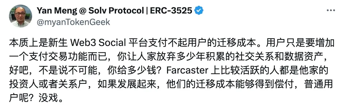 针对这一点,Solv Protocol 联合创始人 Yan Meng 今日曾在 X 评论表示:「本质上是新生 Web3 Social 平台支付不起用户的迁移成本。用户只是要增加一个支付交易功能而已,你让人家放弃多少年积累的社交关系和数据资产,好吧,不是说不可能,你给多少钱?Farcaster 上比较活跃的人都是他家的投资人或者关系户,如果发展起来,他们的迁移成本能够得到偿付,普通用户呢?没戏。」