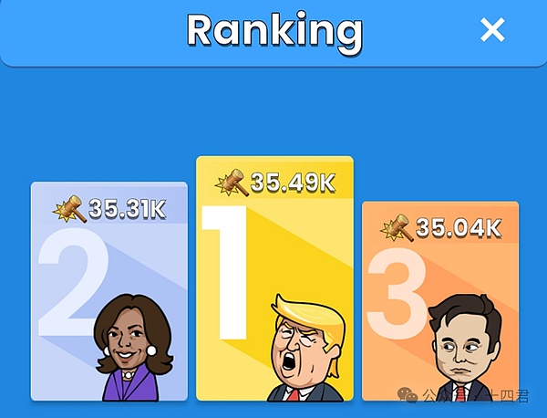 玩家可以通过敲打特朗普、马斯克和哈里斯等热点人物,给每个人物进行“打榜”,以排行榜形式展示了每个角色被敲打的次数。