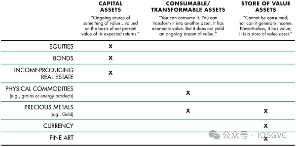 3. 价值存储资产:价值在时/空间上持续存在,具有稀缺性,例如黄金、比特币。