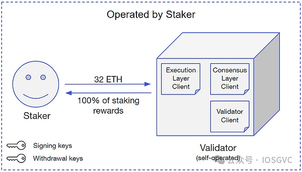 单独质押是所有质押的途径中的基础形式。质押者需要存入 32 个 ETH,并且运行和维护完整的以太坊客户端,保证验证器的正常运行。单独质押有益于提升网络的去中心化程度。