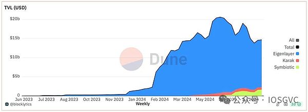 在空投热潮褪去和市场降温之后,EigenLayer 的 TVL 下降了约 20%,步入了我们之前所预测的均值回归时期。长期来看,我们认为 EigenLayer 的再质押不会是情绪面上的短期叙事,而将成为以太坊生态的永久属性,用于外化以太坊的经济安全并且帮助项目进行启动。