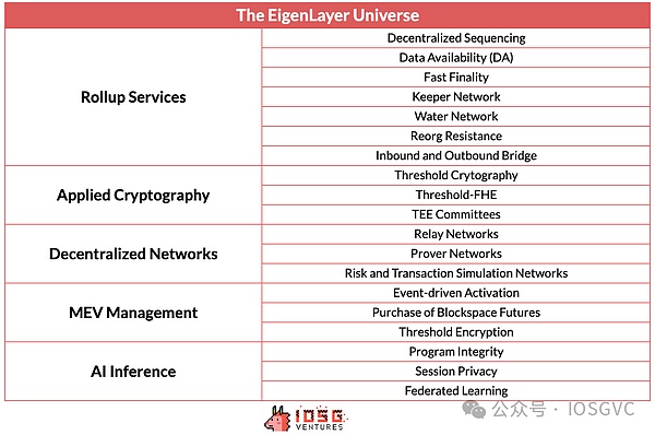 AVS 是 EigenLayer 提供的经济安全所服务的对象。根据 EigenLayer 的官方文档,AVS 涵盖以下基础设施:侧链、数据可用性层、新虚拟机、守护者网络、预言机网络、跨链桥、阈值加密方案、可信执行环境等等。下表列举了更多可能基于 AVS 进行构建的类型。